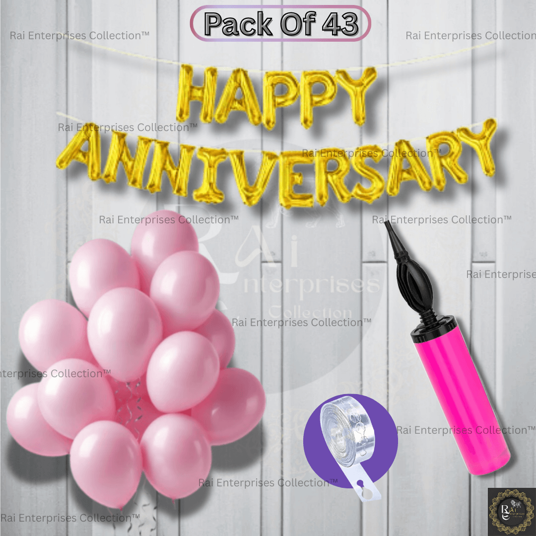 Rai Enterprises Collection™ Make your anniversary celebration unforgettable with this complete decoration kit! Featuring a vibrant Golden “Happy Anniversary” foil balloon banner, 40 elegant pink metallic balloons, a flexible balloon arch, and a handy balloon pump, this 43-piece set has everything you need to create a festive, romantic atmosphere. Whether it’s a home surprise or a party hall setup, this decor kit adds the perfect touch of glamour and love to your special day.