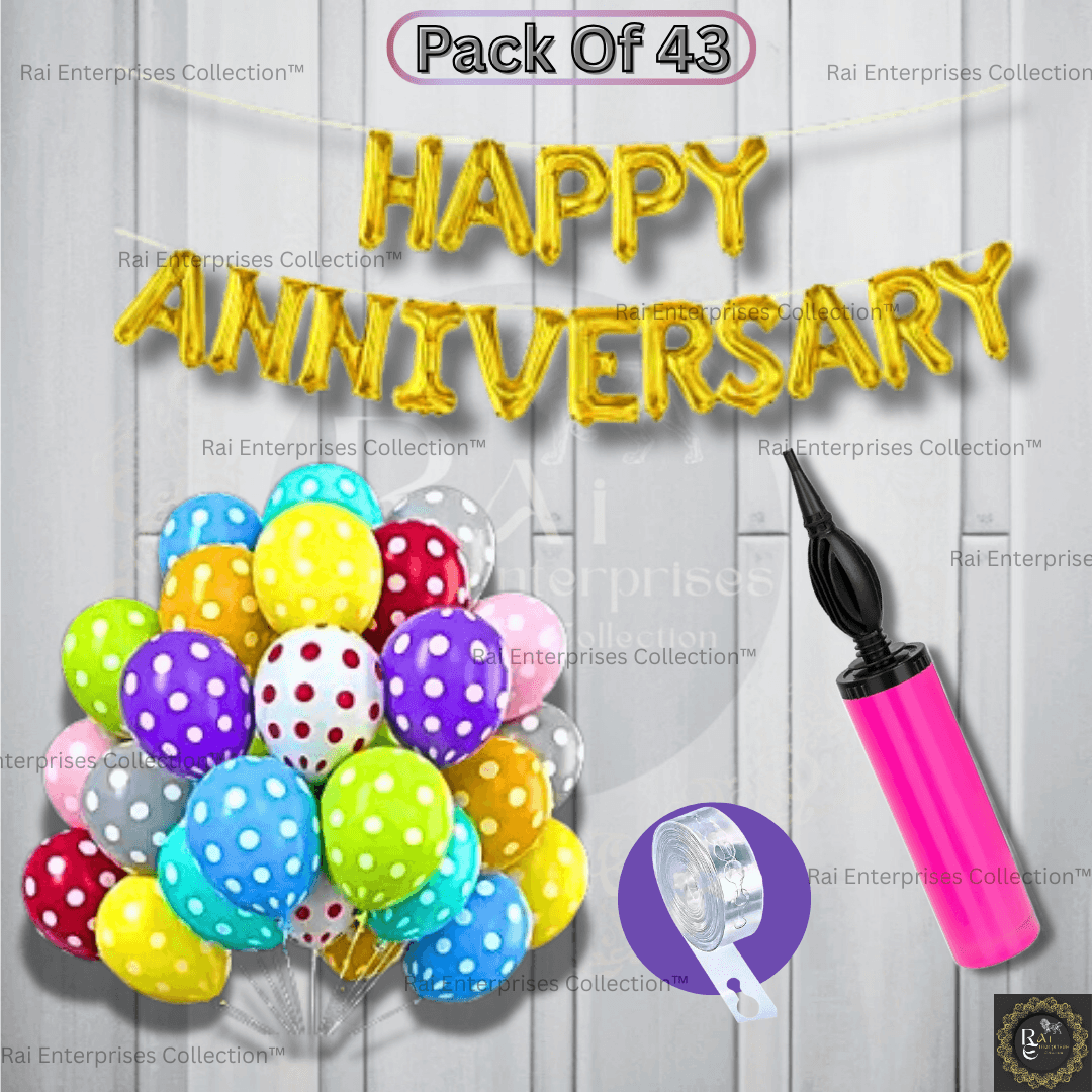 Rai Enterprises Collection™ Make your special day unforgettable with this Golden Happy Anniversary Decoration Kit. Perfect for home or party hall setups, the kit includes a shimmering golden foil balloon banner spelling out “Happy Anniversary,” 40 vibrant multicolour dot metallic balloons, a durable balloon arch strip to create stunning displays, and a handy balloon pump for quick inflation. Ideal for celebrating anniversaries of all kinds—wedding, engagement, or milestone years—this kit brings charm, elegance, and ease to your party decor.