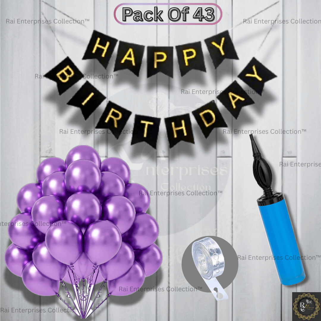 Rai Enterprises Collection™ Make birthdays extra special with our Premium Purple & Black Birthday Decoration Set. This 43-piece kit includes everything you need to set up a stunning party backdrop in minutes. It features 40 high-quality purple metallic balloons that bring a touch of elegance and shine, a stylish black “Happy Birthday” paper banner to add a festive vibe, a balloon arch strip to create a gorgeous balloon arch or garland, and a balloon pump to make setup quick and easy. Ideal for all ages and perfect for birthday parties at home, halls, or outdoor venues.